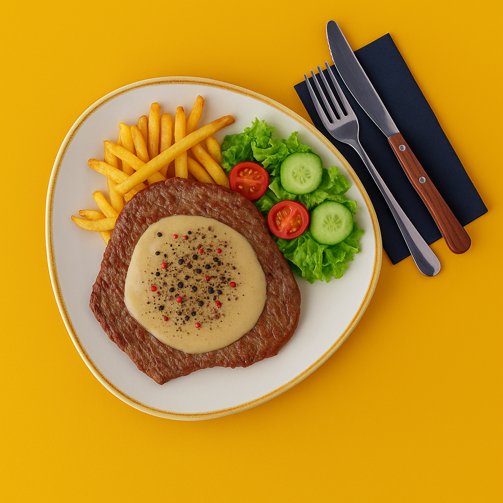 naudan ulkofile, paistettuja kasviksia, pippurikastike