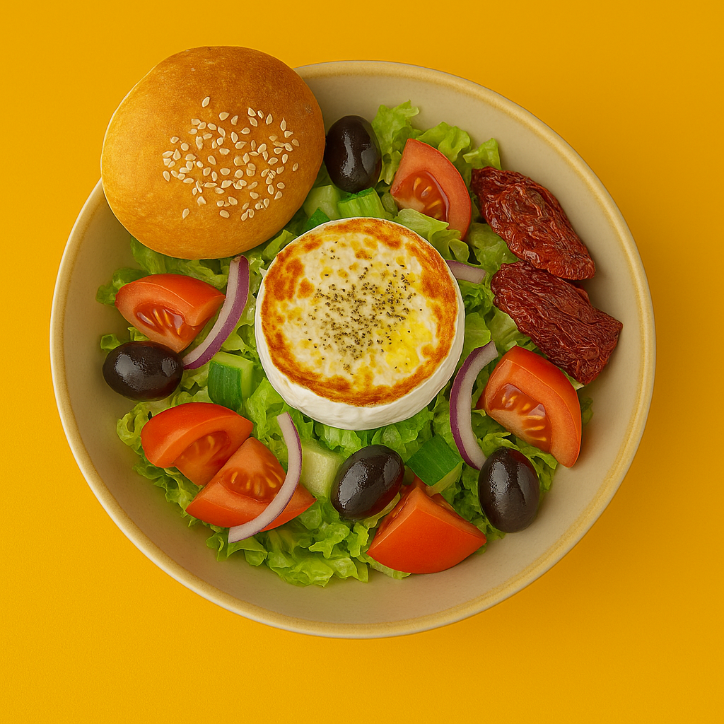vuohenjuusto, rapea salaatti, rucola, tomaatti, kurkku, balsamico kastike, leipä